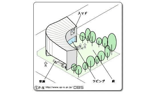 交通量の多い道に面した場合、土地の境界線にそって建物をつくります。さらに、お隣側には大小の樹木を上手に配置。これで雰囲気の良いプライベートな庭をつくることができます。
